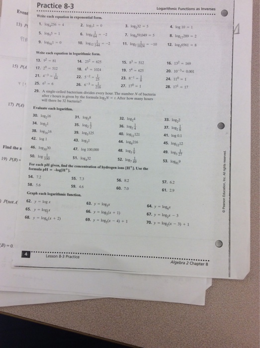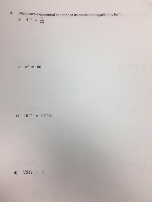 Convert the exponential equation to a logarithmic equation using the logarithm base 8 8 of the right side 1 8. MSN Out Complete the table by finding the appropriate logarithmic or exponential form of the equation as in Example 1. You may not know what number to the third power is 64.