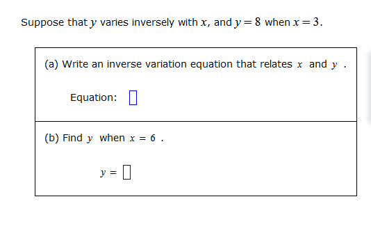 Solved Suppose That Y Varies Inversely With X And Y 8 When Chegg Com